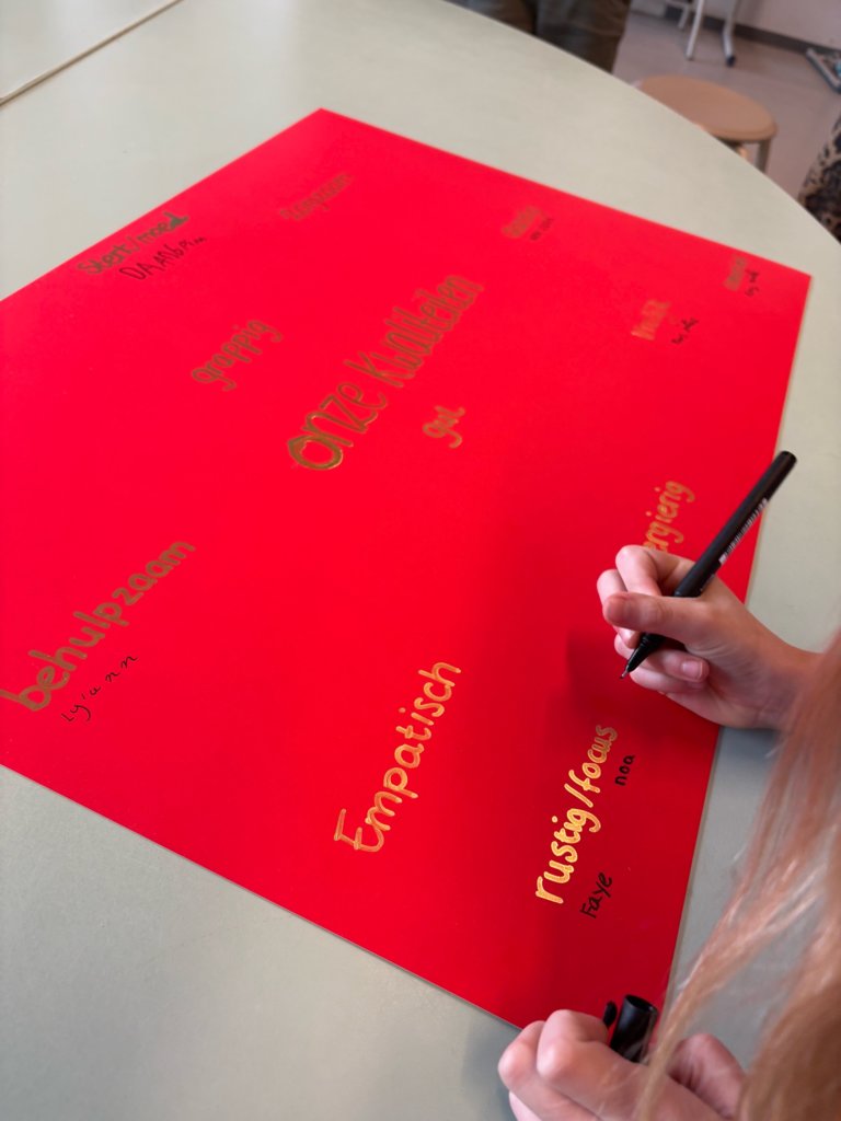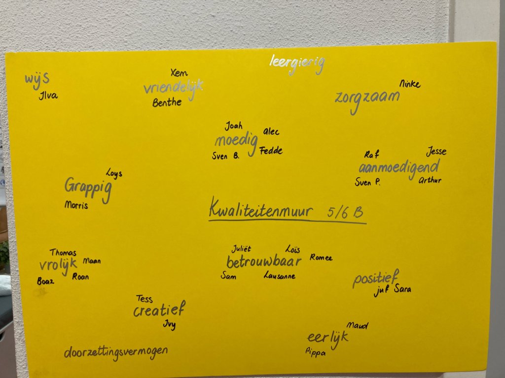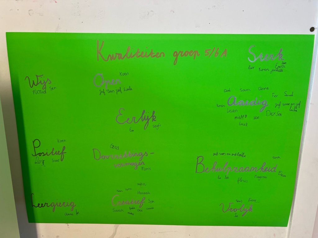 Tot slot deden we een rondje waarbij de leerlingen bij een gekozen kwaliteit de naam van een klasgenoot mochten schrijven die volgens hen goed bij die kwaliteit past. Zo ontstond er een gezamenlijke kwaliteitenposter van de klas.