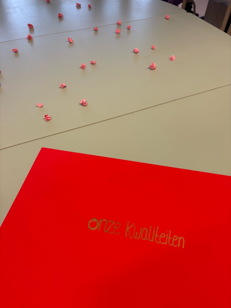 De leerlingen gingen eerst in tweetallen met elkaar in gesprek. Ze bespraken hun eigen kwaliteiten, maar ook welke kwaliteiten zij bij de ander vonden passen. Dit zorgde voor mooie, positieve gesprekken waarin de kinderen elkaar echt moesten bekijken en waarderen.
